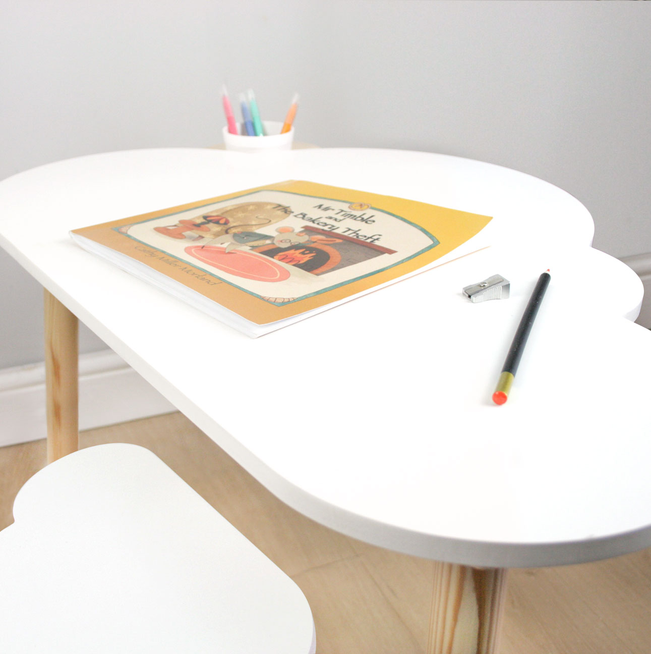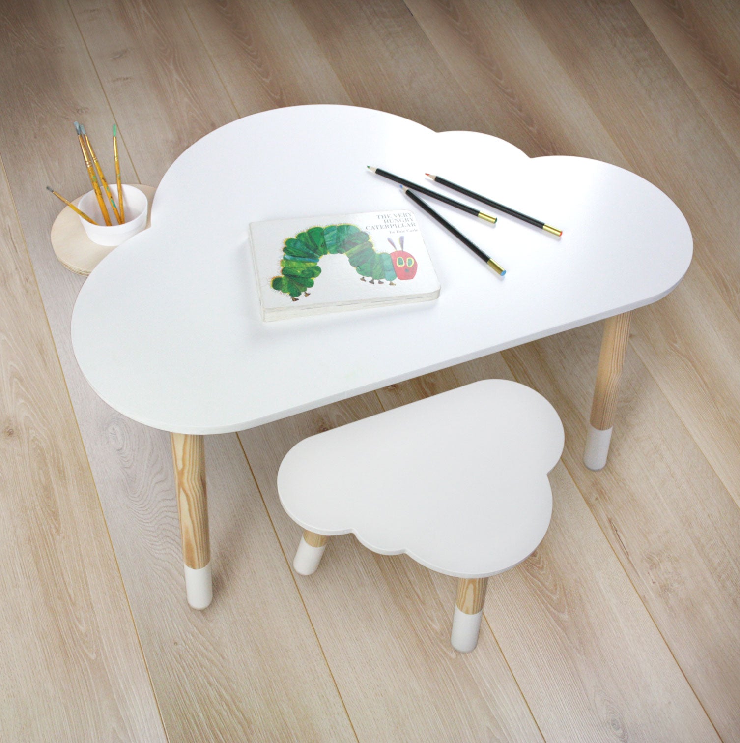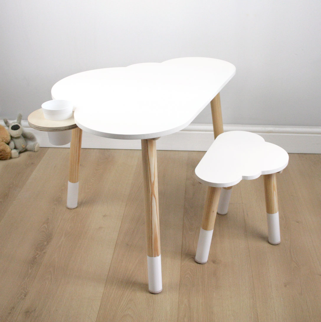 Add some magic to your child's nursery or playroom with our Children's Cloud Desk and Stool Set. Handmade from strong and sturdy solid wood, this Scandinavian inspired set features a unique cloud-shaped desk and optional sun-shaped cup holder that adds a touch of magic to any space. Make learning fun and stylish with this multi-function beautiful nursery furniture. Handmade and designed in the UK by shelvee.com