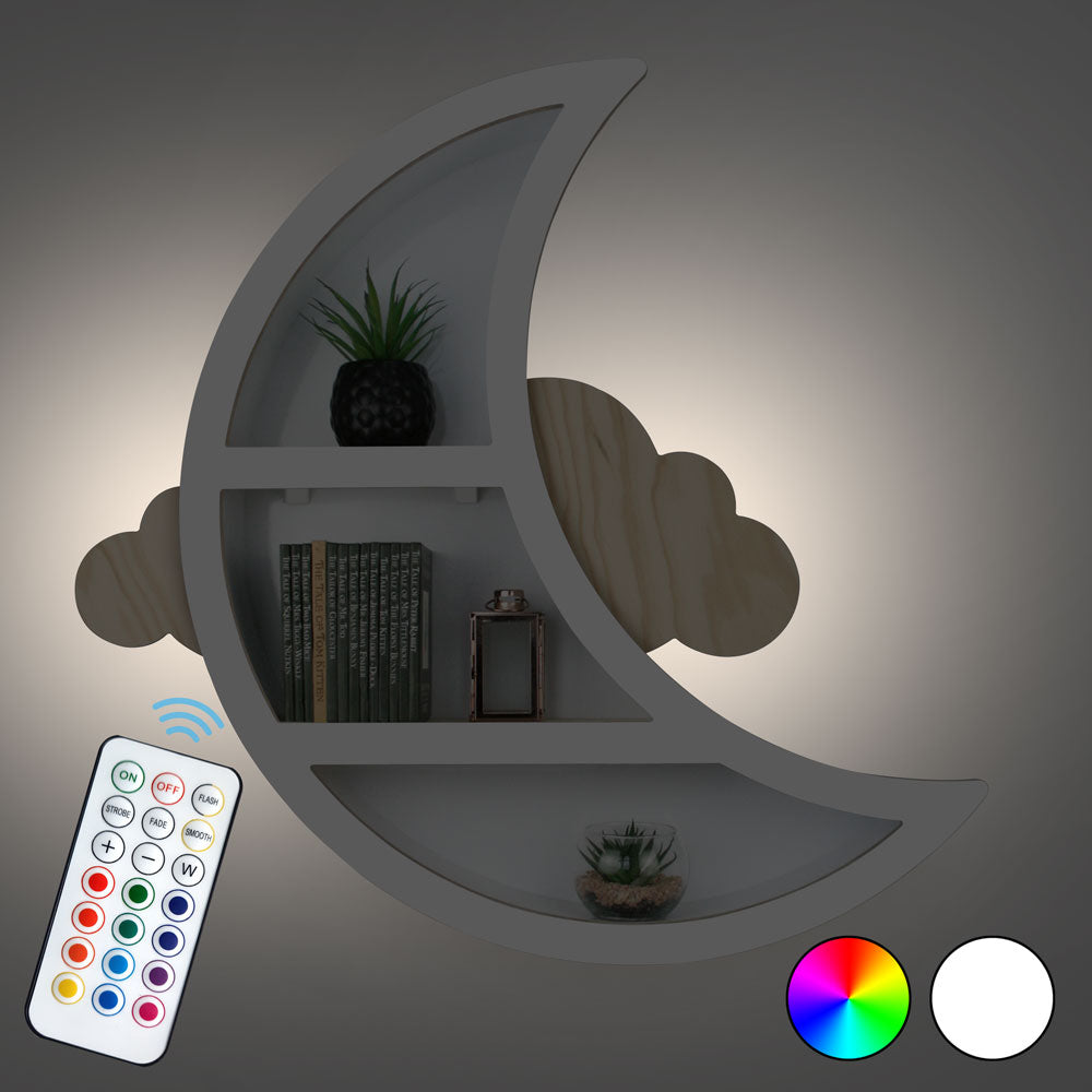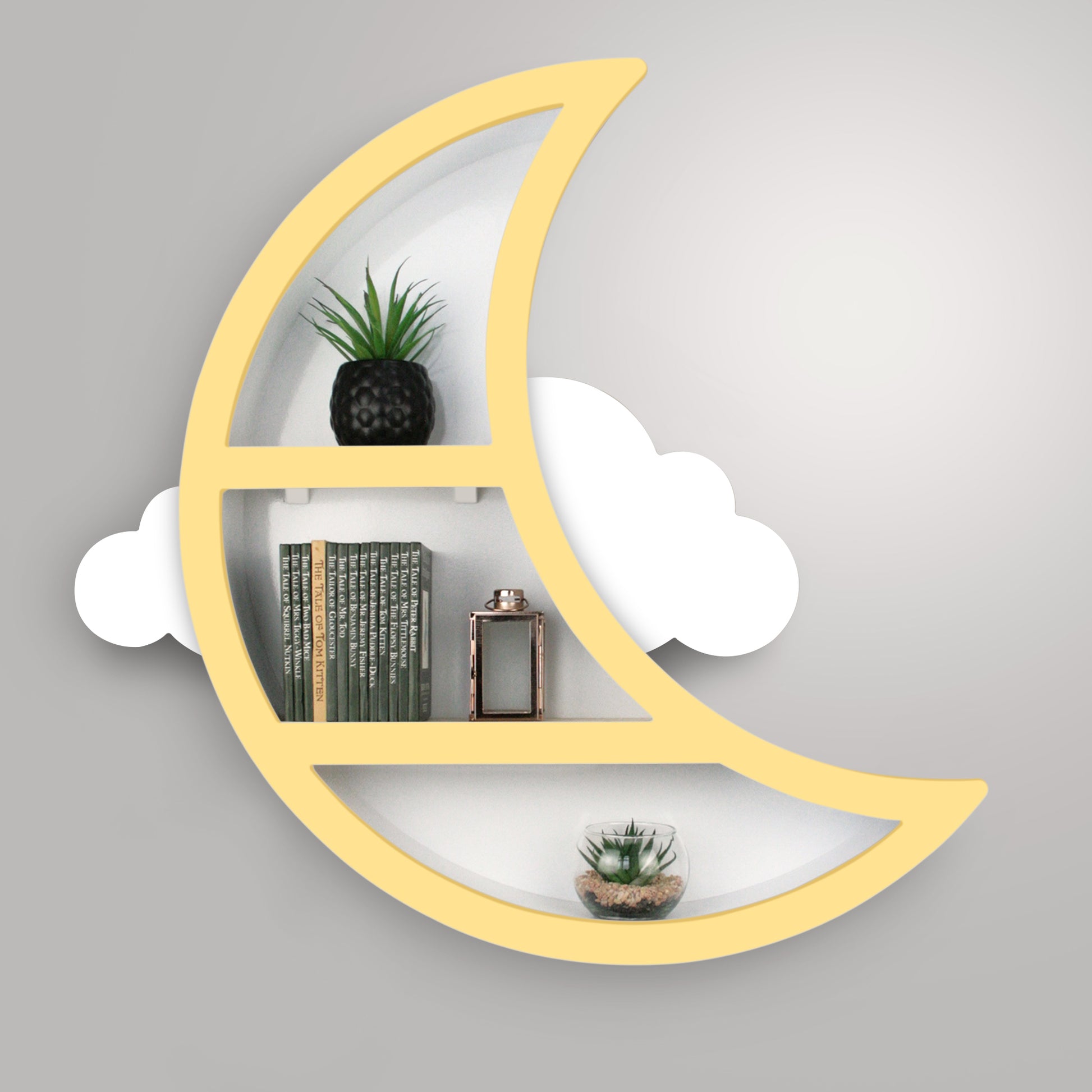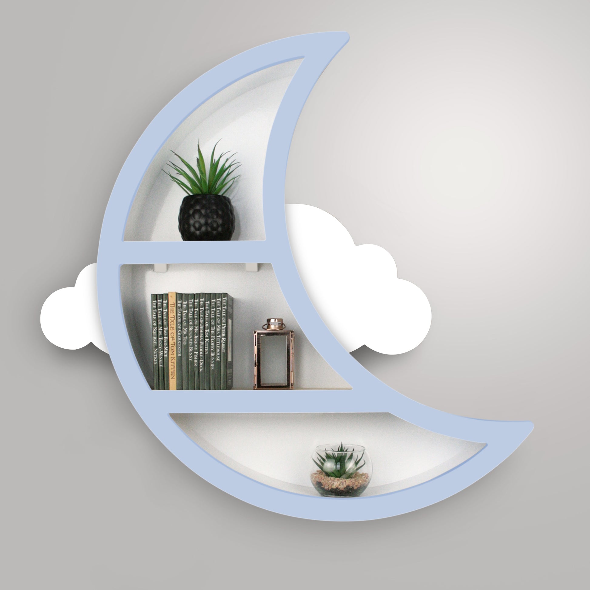 Create a fun kids space and a real focal point with this unique moon shaped wall shelf with cloud effect and hanging stars, perfect nursery furniture for storage and decoration. Offered in a variety of colours and optional multi coloured backlighting for you to bespoke your order. A great addition when creating a child friendly environment for your child's bedroom or nursery furniture theme ideas. Handmade and designed in the UK by shelvee.com